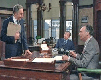 Sir Humphrey Appleby (left) talking to Jim Hacker (right)