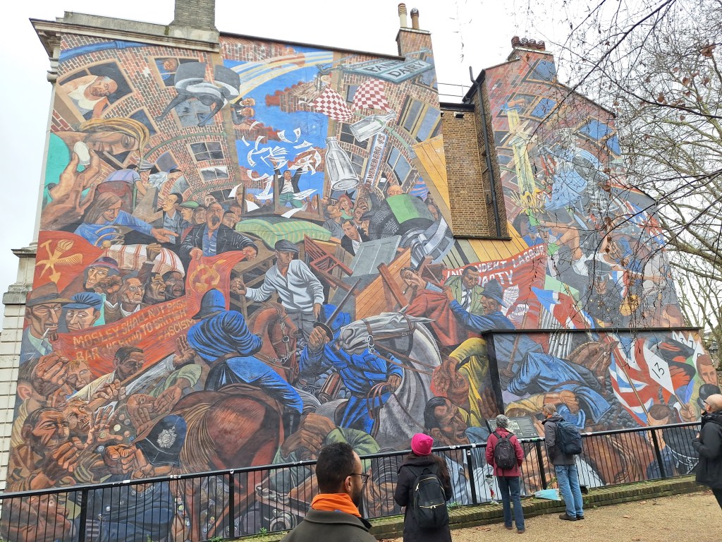 We finished our tour in the East End. One stop was the Cable Street Mural (1983) by Dave Binnington and several collaborators, commemorating the Battle of Cable Street in 1936. The mural is colourful and chaotic, commemorating a collective struggle, not any individual. Its overall message is many different plucky East-Enders uniting against symbols of power, violence and conformity.